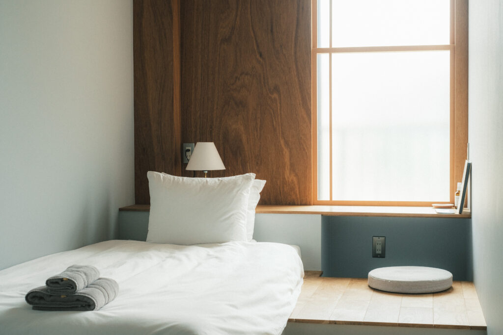 わたしたち「ANGLE」の客室は、とてもミニマルなつくりをしています。 街にあふれるたくさんの情報から一度はなれて、ぴんと張っていた心の糸を、そっと緩めるような時間を過ごしてほしい。そんな想いで、宿を営んでいます。