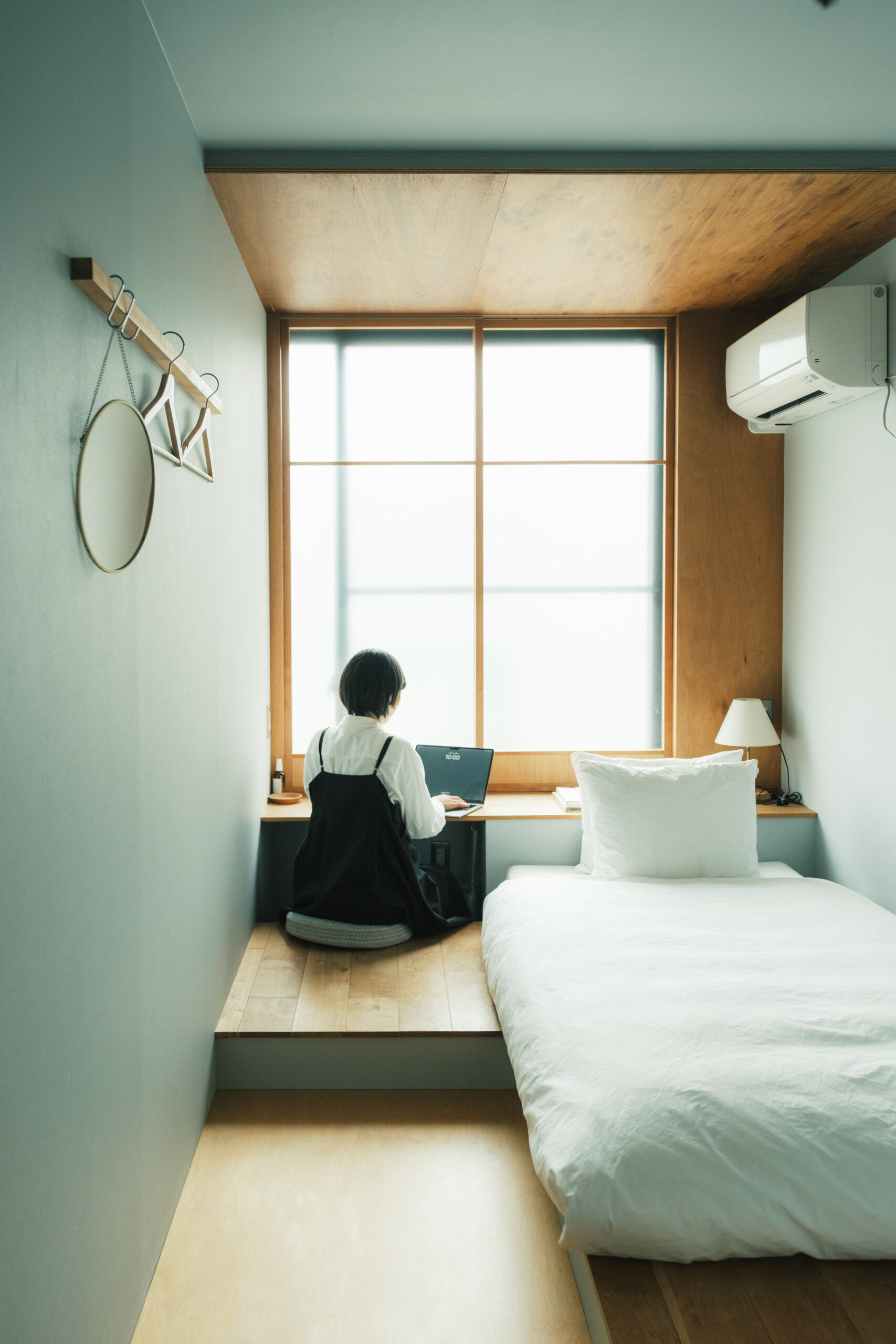 日中のシングルルームは、南側にある窓からたっぷりと光が入り、気持ち良いです。
